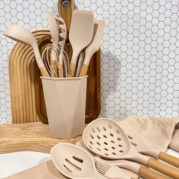 Кухонний набір із силікону з відерцем, 10 предметів бежевий