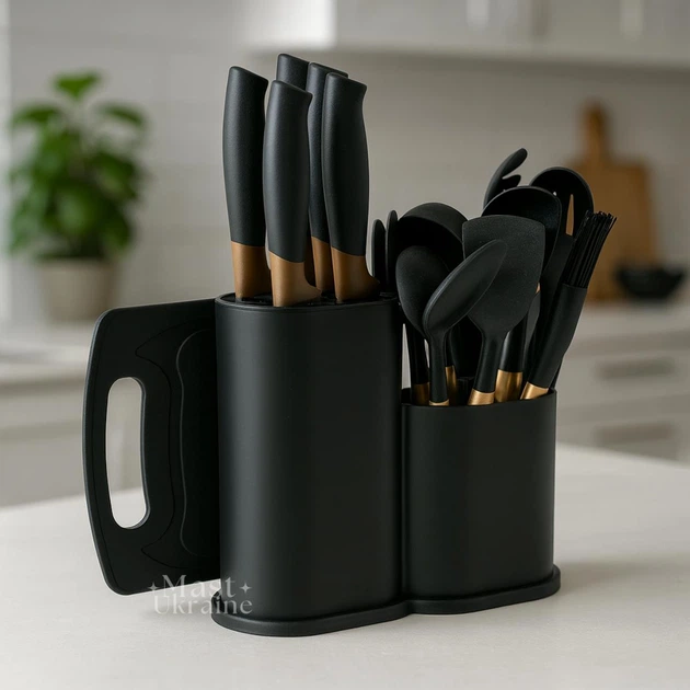 Набір кухонного приладдя 19 предметів з підставкою і дошкою KitchenSet, універсальний комплект аксесуарів та ножів для кухні