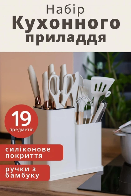 Набір кухонного приладдя на 19 предметів, силіконові прибори та набір ножів на підставці та дошка для нарізання Білий