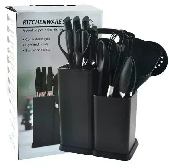 Набір кухонного приладдя на 19 предметів, силіконові прибори та набір ножів на підставці та дошка для нарізання Чорний