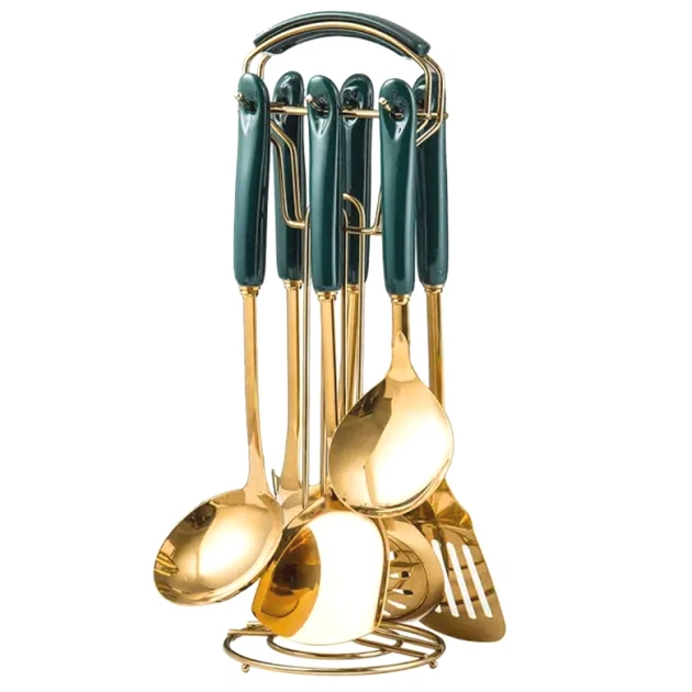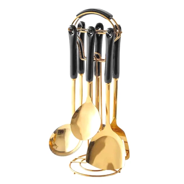 Набір кухонного приладдя на підставці 7 предметів чорний із золотом із нержавіючої сталі для готування та сервірування (5243