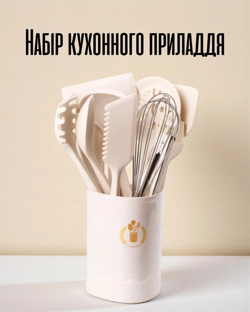 Набір кухонного приладдя 12 предметів з дерев’яними ручками | Силіконові аксесуари на підставці 32 см