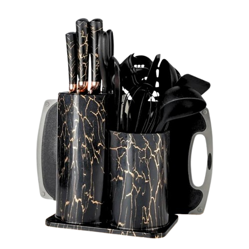Набір кухонного приладдя 25 предметів з подвійною підставкою обробною дошкою набором ножів прихватками Чорний мрамор