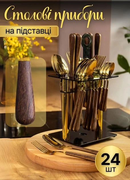 Набір столових приборів на 6 осіб 24 предмети прилади з нержавіючої сталі ложки виделки ножі на підставці Золото