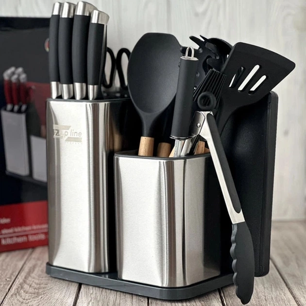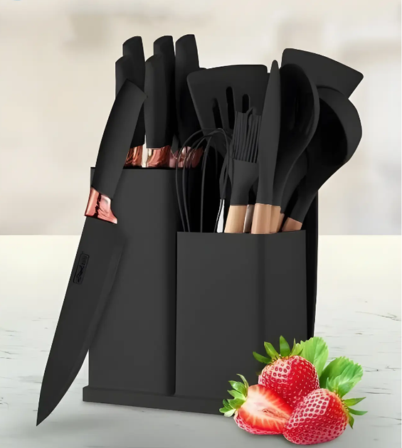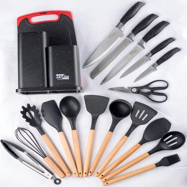 Набір ножів та кухонне начиння Zepline ZP-067 із силікону з підставкою 19 предметів Чорний