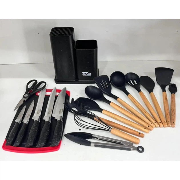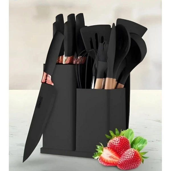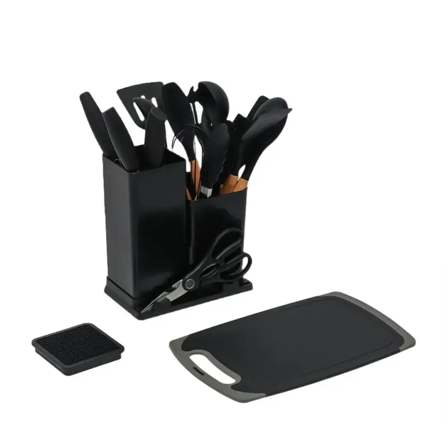 Набір кухонного приладдя на 19 предметів, силіконові прибори та набір ножів на підставці та дошка для нарізання, Чорний