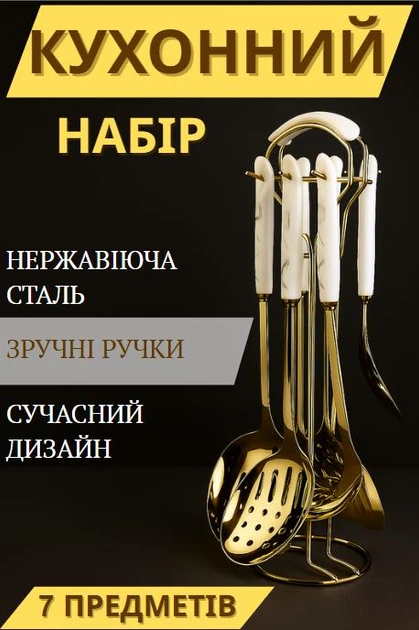 Набір кухонного приладдя 7 предметів з нержавіючої сталі з керамічними ручками золото з білим