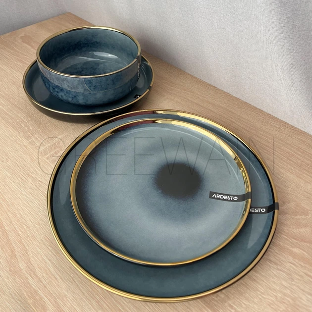 Сервіз столового посуду 12 предметів 3 персони ARDESTO Andria синього кольору з золотим кантом кераміка