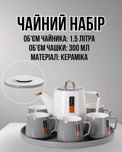 Чайний сервіз на 6 персон із керамічною підставкою, сірий, набір для чаювання, посуд для чаю