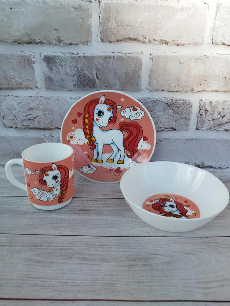 Дитячий набір столового посуду Рожевий Єдиноріг склокераміка 3 предмети