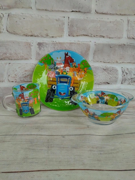 Дитячий набір столового посуду Metr+ Синій трактор скляний 3 предмети ST1