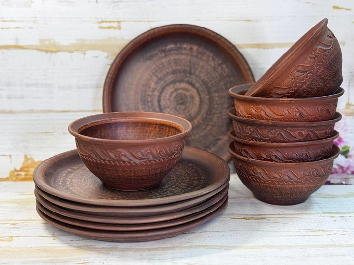 Набір посуду з червоної глини 6 плоских 25 см та 6 глибоких тарілок 600 мл