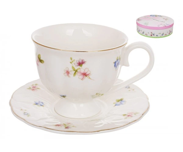 Чайний фарфоровий набір Вінтаж Флорал: 6 чашок 200мл, 6 блюдець, колір - білий з квітковим дизайном та золотим обідком