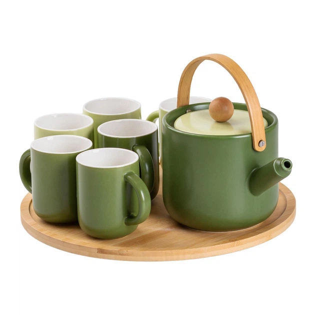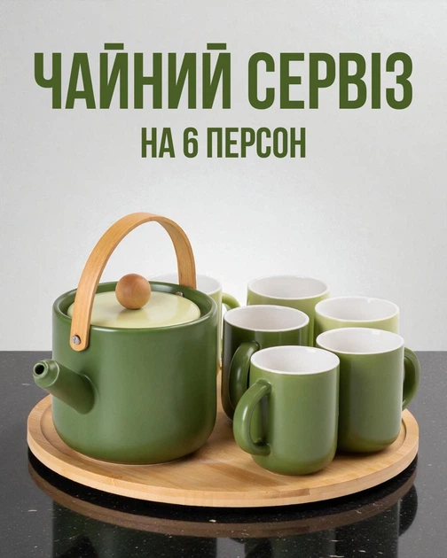 Чайний сервіз керамічний на 6 персон з бамбуковою поворотною підставкою, зелений