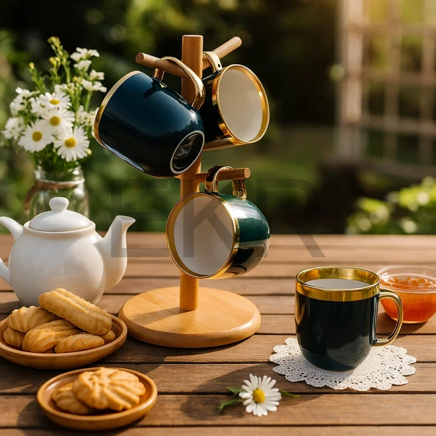 Набір (4 шт) порцелянових чашок 320мл "Золота лінія" на бамбуковій підставці, колір - темно-зелений (905-233)