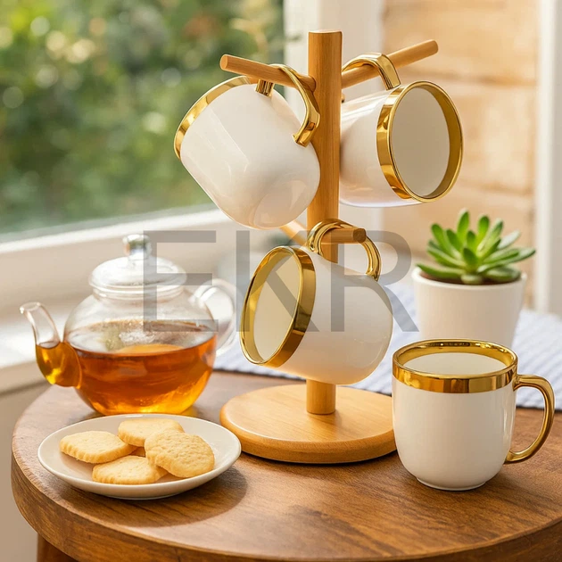 Набір (4 шт) порцелянових кухлів 320мл "Золота лінія" на бамбуковій підставці, колір - білий (905-229)