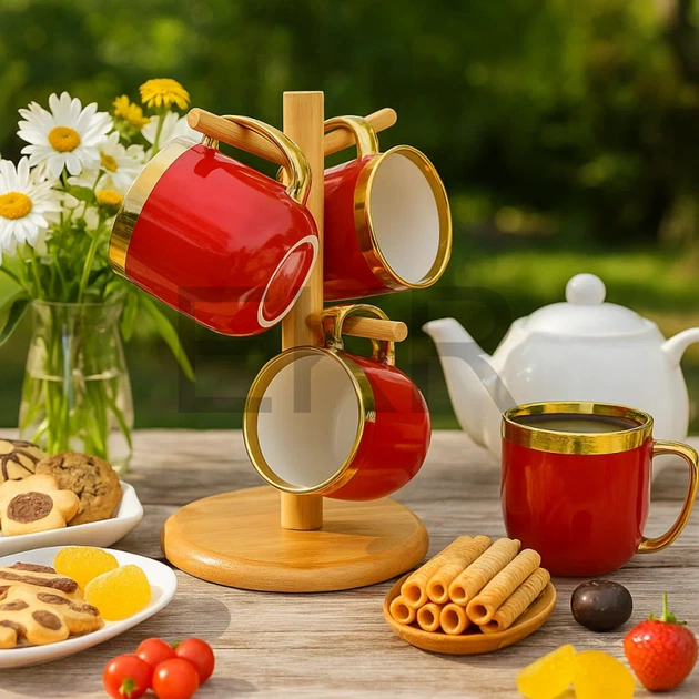 Набір (4 шт) порцелянових чашок 320мл "Золота лінія" на бамбуковій підставці, колір - бордо (905-235)