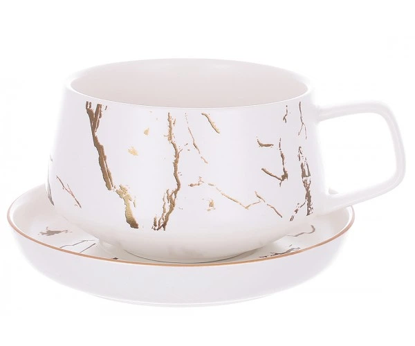 Чайний набір чашка з фарфоровим блюдцем Мармурова розкіш, 320мл, колір - білий із золотом 805-728