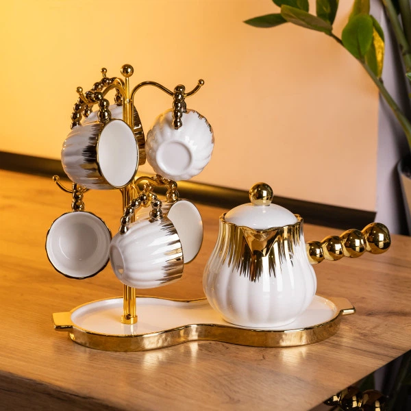Кофейный сервиз на подставке с кофейником 450 (мл) 6 чашек по 90 (мл) подарочный набор чашек на подставке Белый с золотом FM
