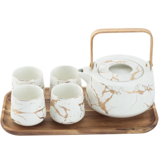 Порцеляновий чайний сервіз "Білий мармур" із дерев'яною тацею