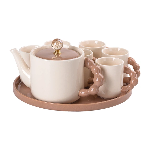 Чайний сервіз на 6 персон з фарфоровою підставкою керамічний набір для чаю та кави бежевий (523576)