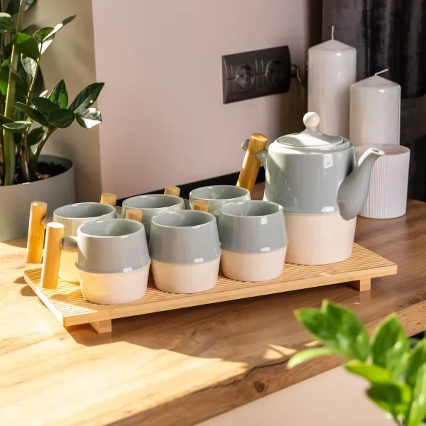 Чайний сервіз порцеляновий на бамбуковій підставці 8 предметів, сірий з білим