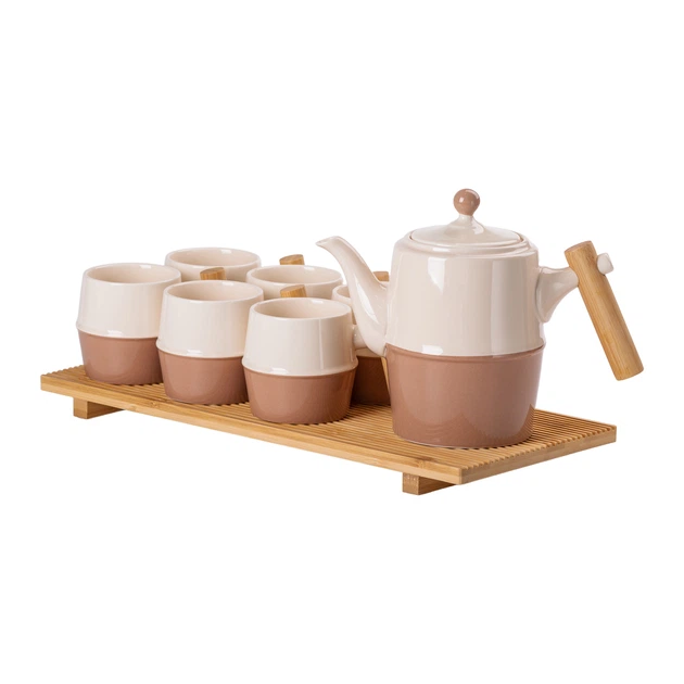 Чайний сервіз порцеляновий на бамбуковій підставці 8 предметів, коричневий з білим