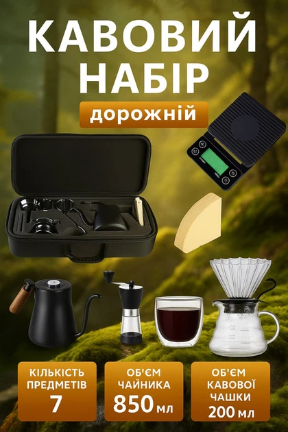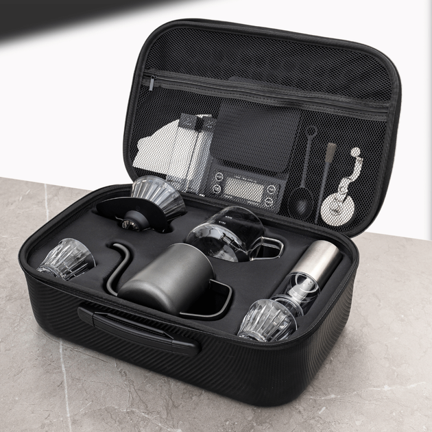 Подарунковий похідний кавовий набір з 12 предметів у кейсі для приготування фільтр кави