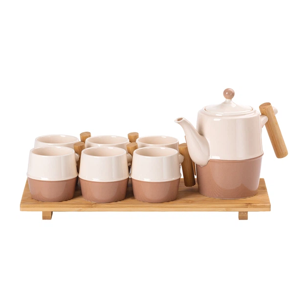 Чайний сервіз на 6 персон з бамбуковою підставкою коричневий керамічний набір для чаювання та кави (523573)