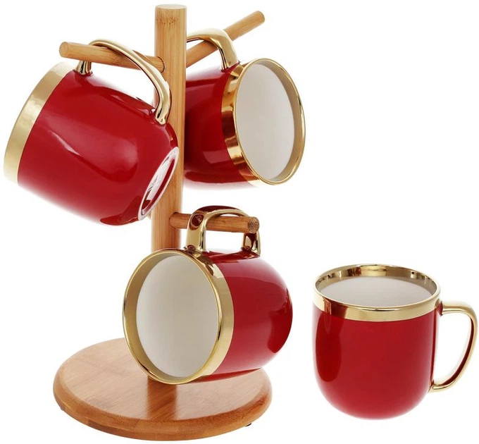 Чайний набір "Золота Лінія" 4 кружки 320мл на бамбуковій стійці, бордо.