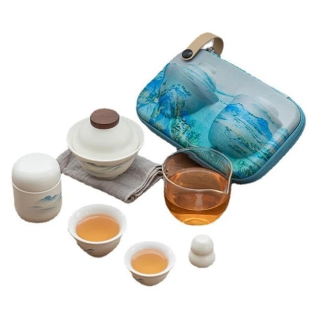 Портативний набір для чайної церемонії у футлярі: керамічна гайвань, чахай зі скла, піали та контейнер