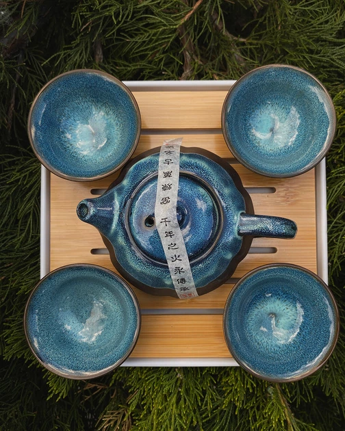 Чайний набір у коричневому кейсі (10 предметів) - темно-синя кераміка з принтом