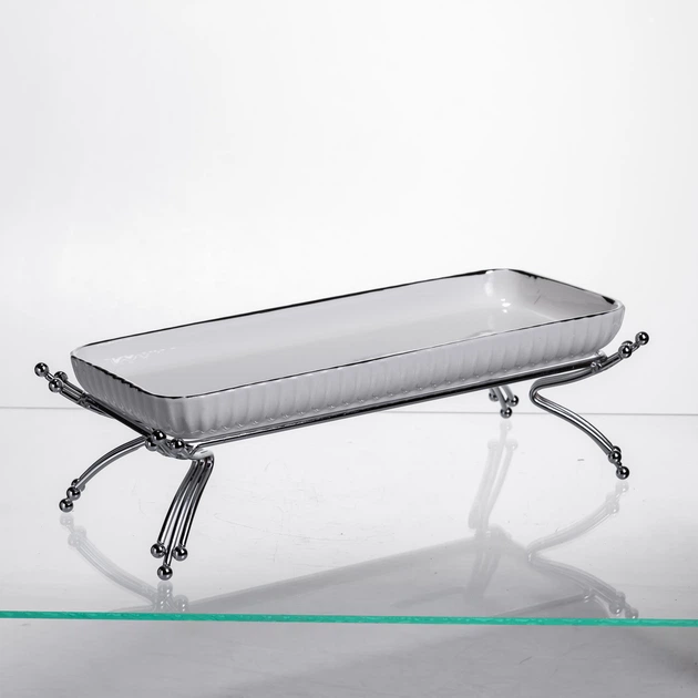 Порцелянове блюдо для сервірування на металевій підставці 29,5129 (см) Біле зі сріблом