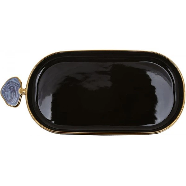 Блюдо фарфорове "Gold Line" 36х16.5см овальне з декоративною ручкою, чорне (111399)