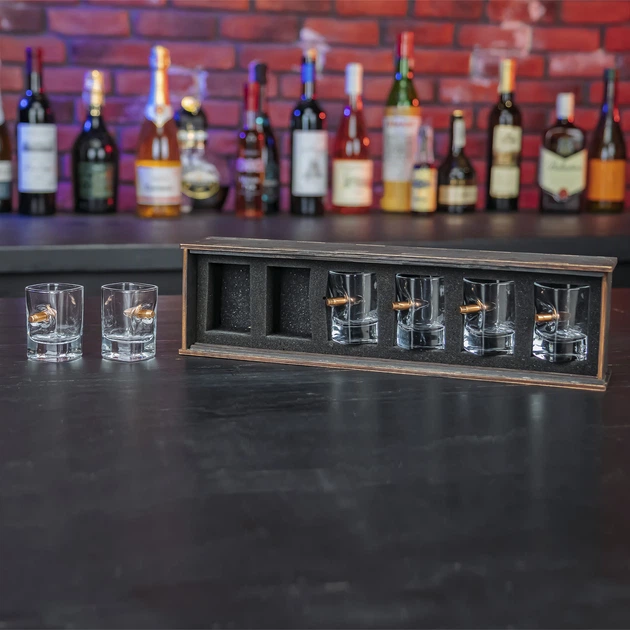 Набір квадратних чарок 6 шт куля, пуля, герб + деревяна коробка, uwest