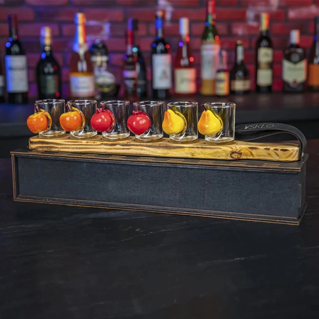 Набір чарок "Літо" на підставці 6 шт гранат, груша, яблуко + дерев'яна коробка, uwest
