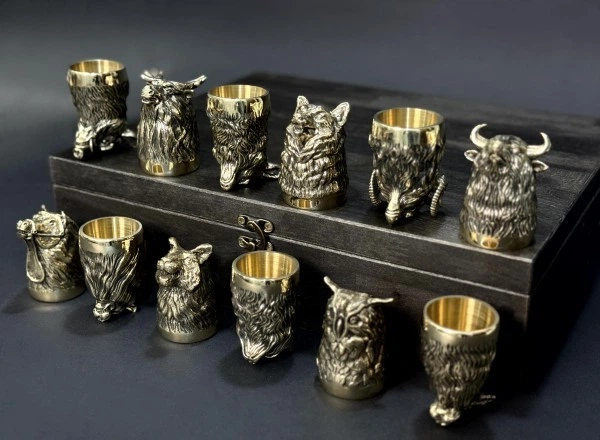 Набір чарок із бронзи "Мисливські" - 12 шт в дерев'яному кейсі (pn50)