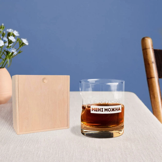 Склянка із кулею "Я програміст мені можна" у дерев'яній подарунковій коробці