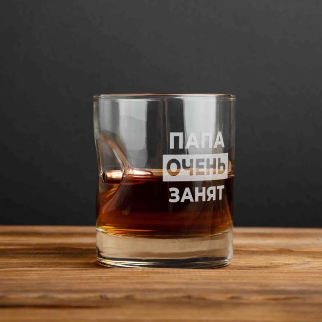 Склянка з кулею "Тато дуже зайнятий" для віскі, російська, Дерев'яна подарункова коробка 4602256