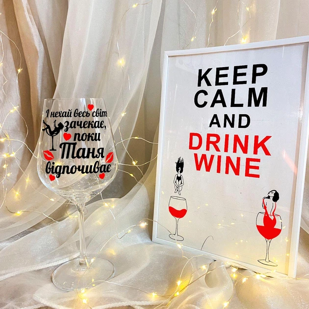 Винний келих на подарунок з дизайном "І нехай весь світ зачекає, поки Таня відпочиває" 450 мл