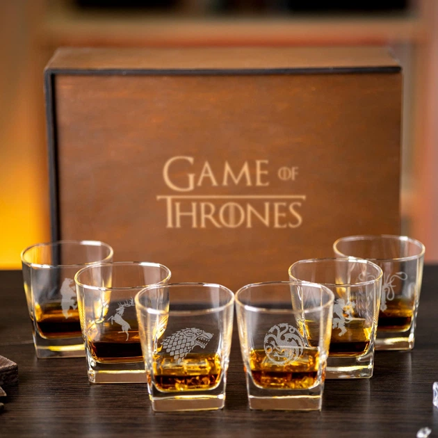 Скляний набір для віскі з гравіюванням “Гра Престолів” у дерев’яній коробці, 6 склянок, WOODPRESENT