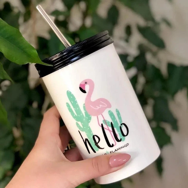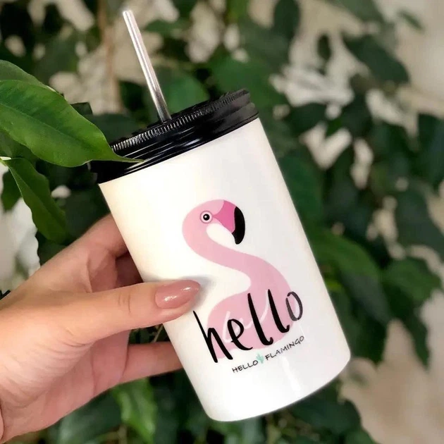 Стакан з кришкою і трубочкою керамічний "Фламінго", 500мл (Стакан для кави) Привітання