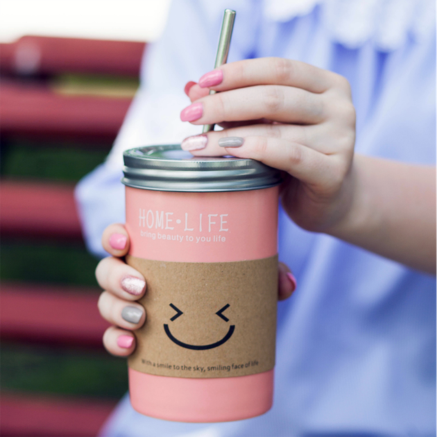 Стакан з кришкою і трубочкою керамічний "Смайл", 500мл (Стакан для кави) Рожевий