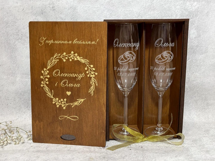 Бокали Arty Craft для шампанського на річницю весілля з лазерним гравіюванням у дерев’яній коробці 220 мл 2 шт
