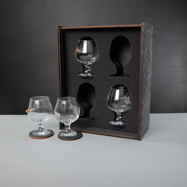 Набір для коньяку скляний, 4 келихи зі вставками куля + герб | Подарунок військовому ЗСУ 225-001-181