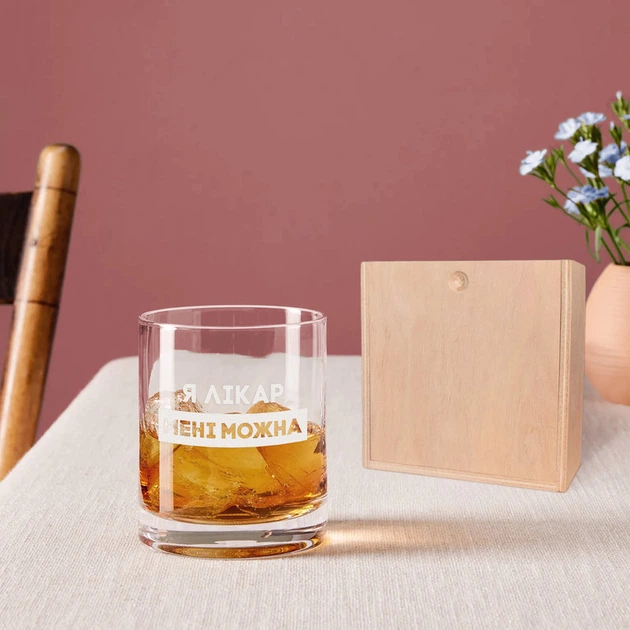 Склянка для віскі кругла "Я лікар мені можна" у дерев'яній подарунковій коробці