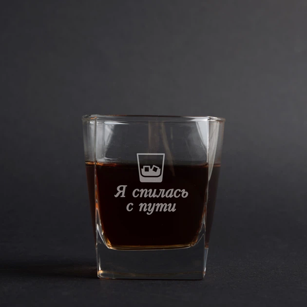 Склянка для віскі "Я спилась с пути", російська, Дерев'яна подарункова коробка з гравіюванням