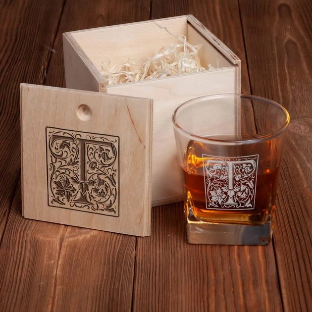 Склянка для віскі у дерев'яній коробці "Вензель" персоналізований, Дерев'яна подарункова коробка з гравіюванням