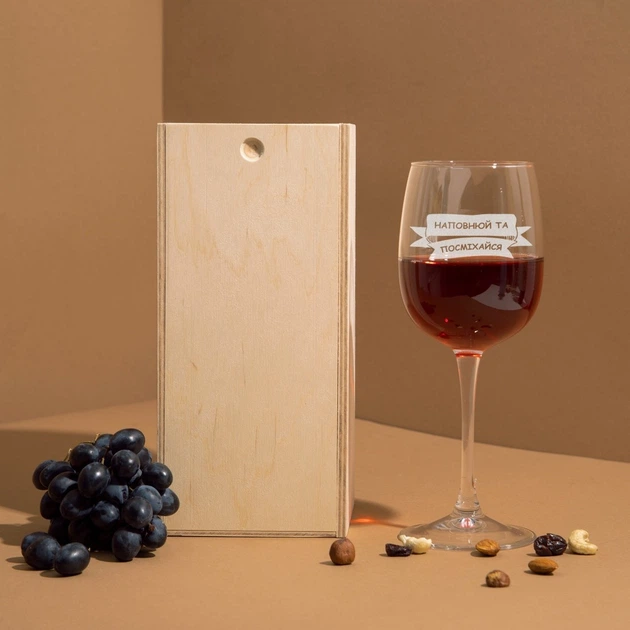 Келих для вина "Наповнюй та посміхайся" у дерев'яній подарунковій коробці 4632047