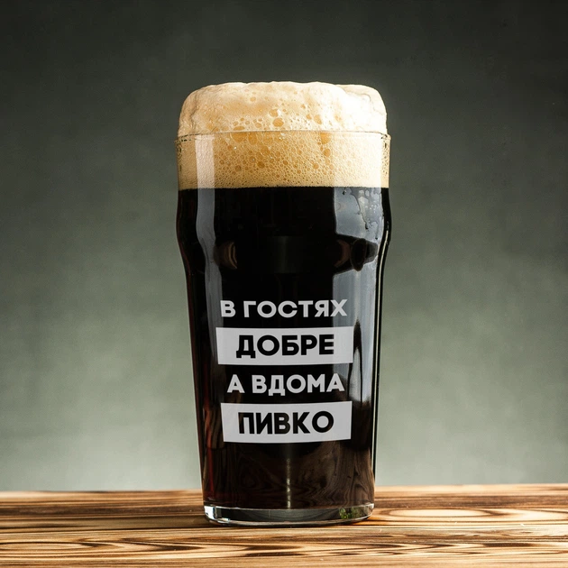 Келих для пива "В гостях добре, а вдома пивко", українська, Дерев'яна подарункова коробка